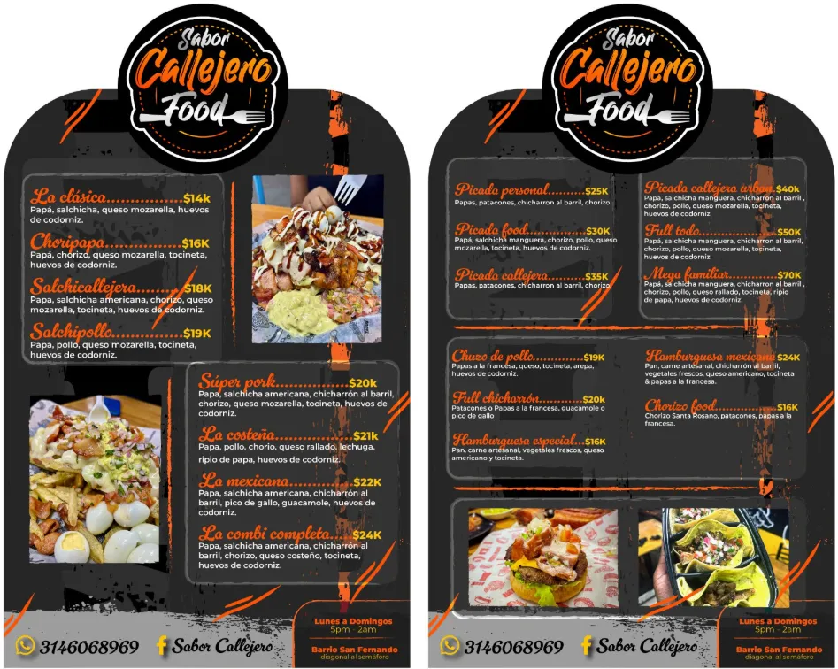 En Sabor Callejero somos pasión por la comida hecha al momento y el auténtico sabor de la calle. Creamos un espacio donde la buena comida, el ambiente relajado y la energía de compartir se unen para brindarte una experiencia gastronómica única. Cada plato lo preparamos con dedicación, buscando que disfrutes sabores intensos, porciones generosas y ese gusto callejero que siempre provoca volver.